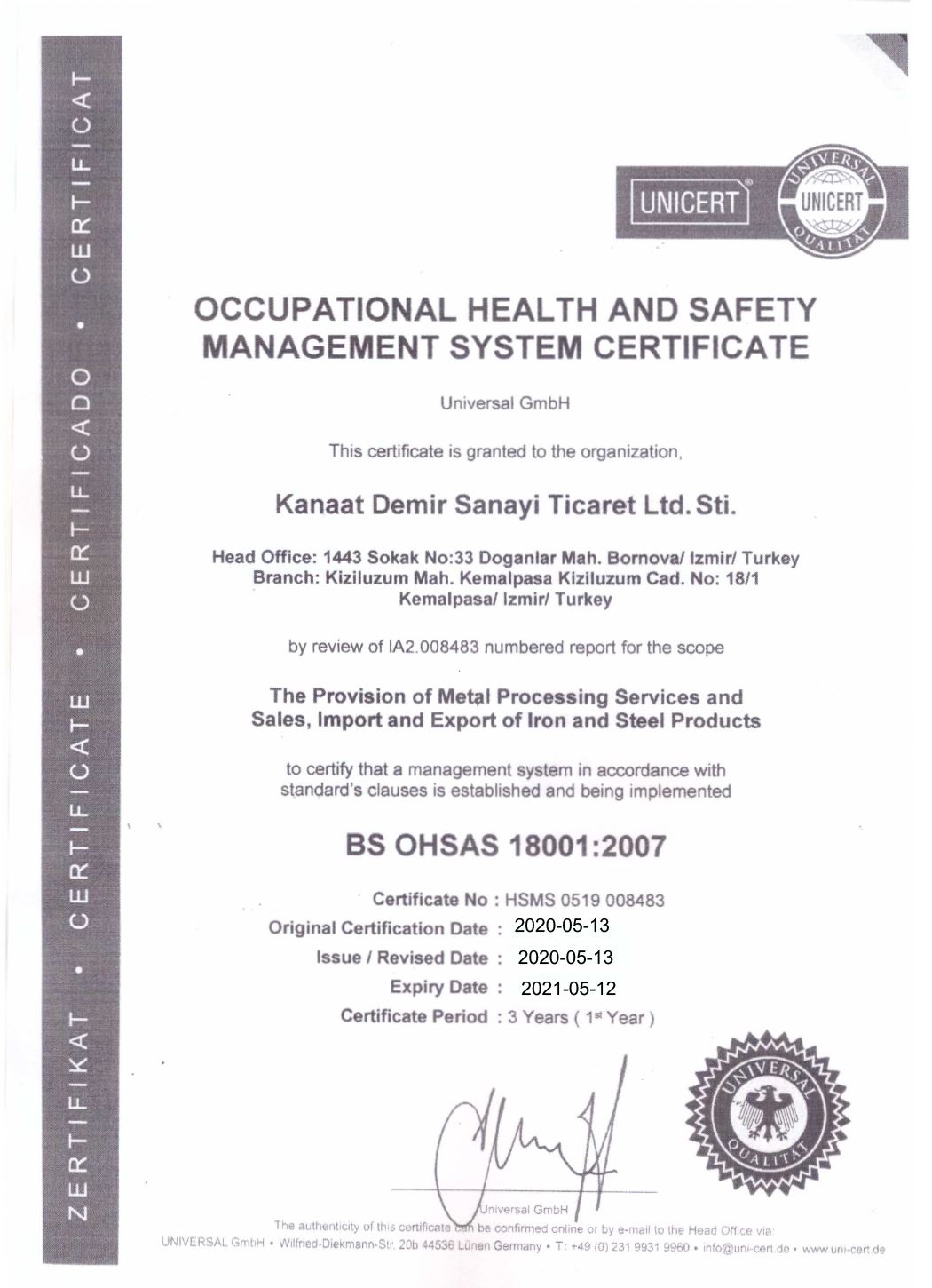 İŞ SAĞLIĞI ve GÜVENLİĞİ SERTİFİKASI