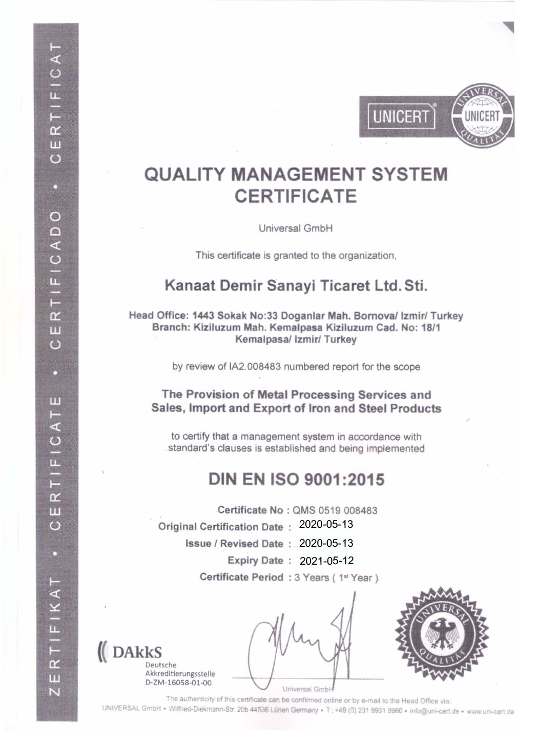 KALİTE YÖNETİM SİSTEMİ SERTİFİKASI