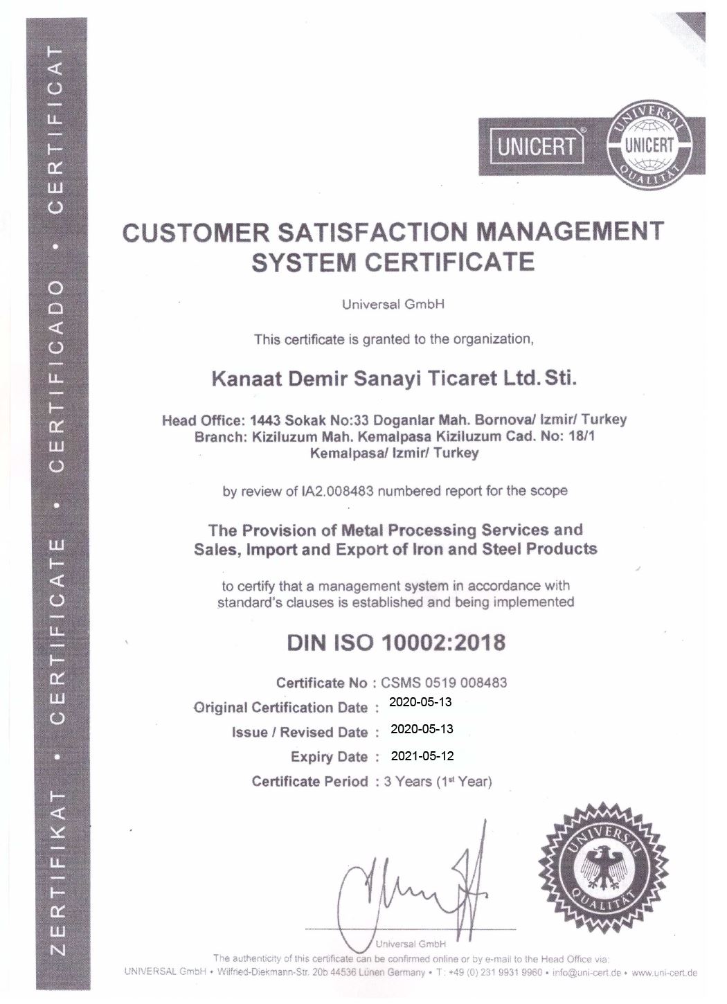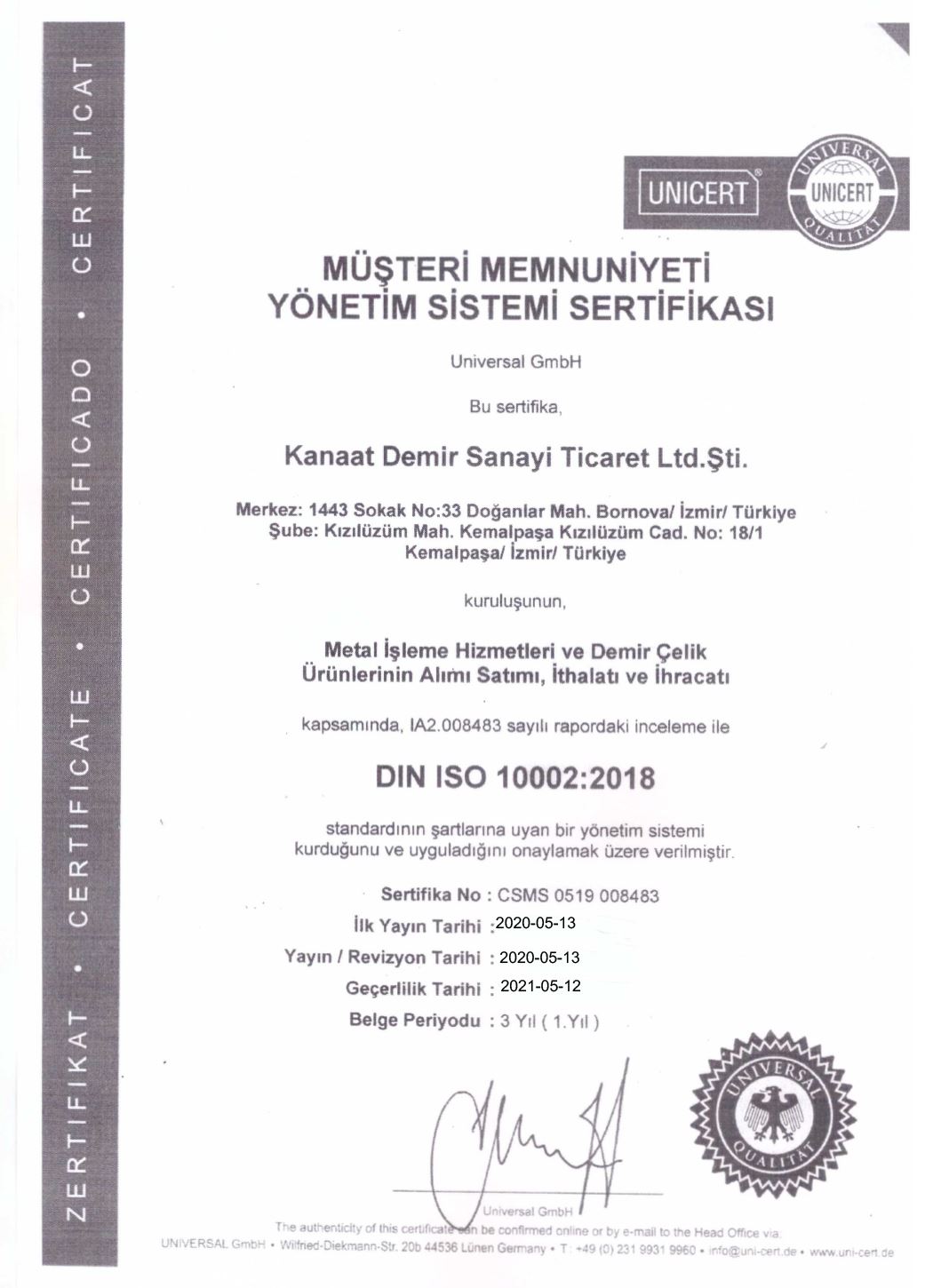 MÜŞTERİ MEMNUNİYETİ SERTİFİKASI